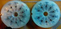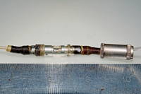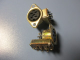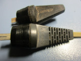 Попались весьма редкие и необычные анодные высоковольтные коннекторы для ламп типа ГМИ-3. Редки они тем, что на электронные лампы анодные колпачки с резиновой "присоской" весьма нечастое решение:![]() Две присоски концами залиты в текстолитовую колодку с фиксирующим разъемом--тоесть, от одного провода сразу питалось 2 лампы анодным напряжением: