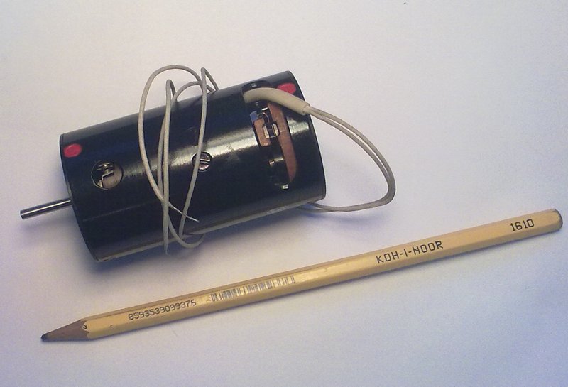 Швейцарский микроэлектродвигатель постоянного тока фирмы Escap серии 22 (габаритный диаметр 22 мм). Золотые щётки, полый 5-ти полюсный ротор. Без нагрузки начинает вращаться от напряжения 100 мВ, потребляя ток 2 мА.
